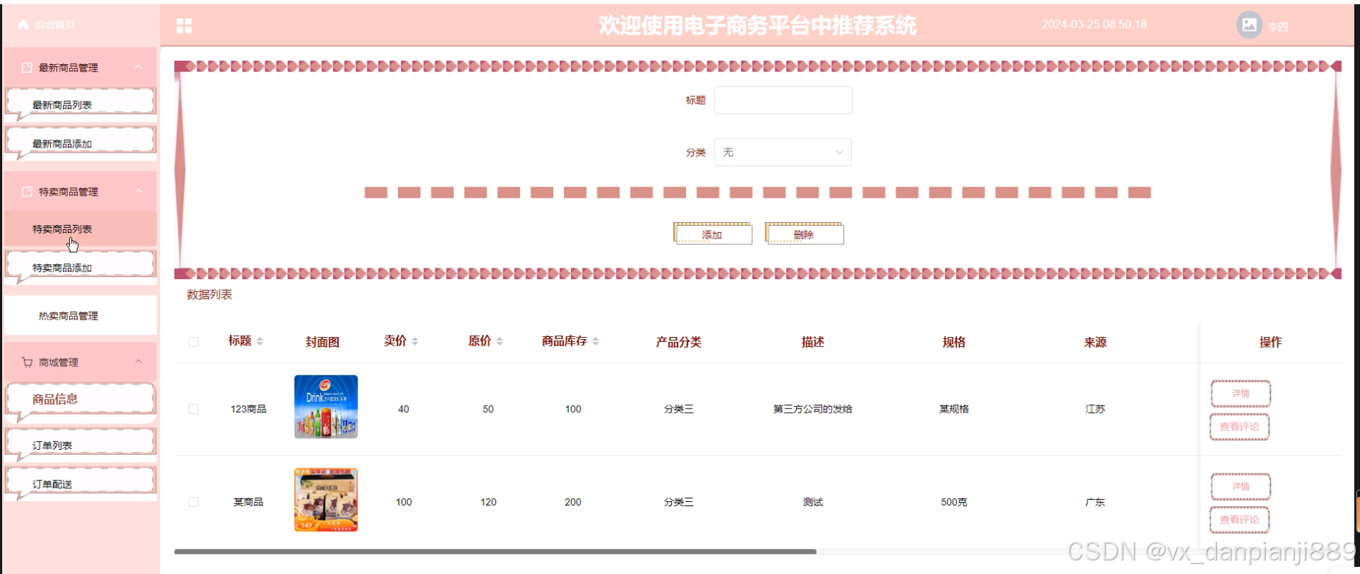 - 特卖商品管理:用户可以查看特卖商品列表中某个商品的详情和评论信息,可以对特卖商品信息进行查询、重置、添加和删除操作。