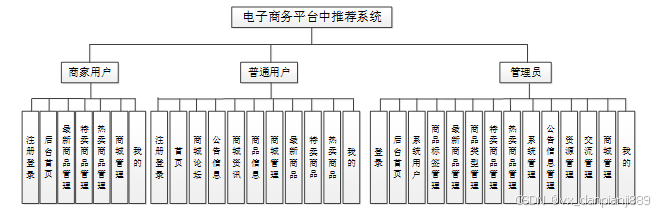 按照电子商务平台中推荐系统的设计与实现的角色,主要包括商家用户、普通用户和管理员这三大功能模块。