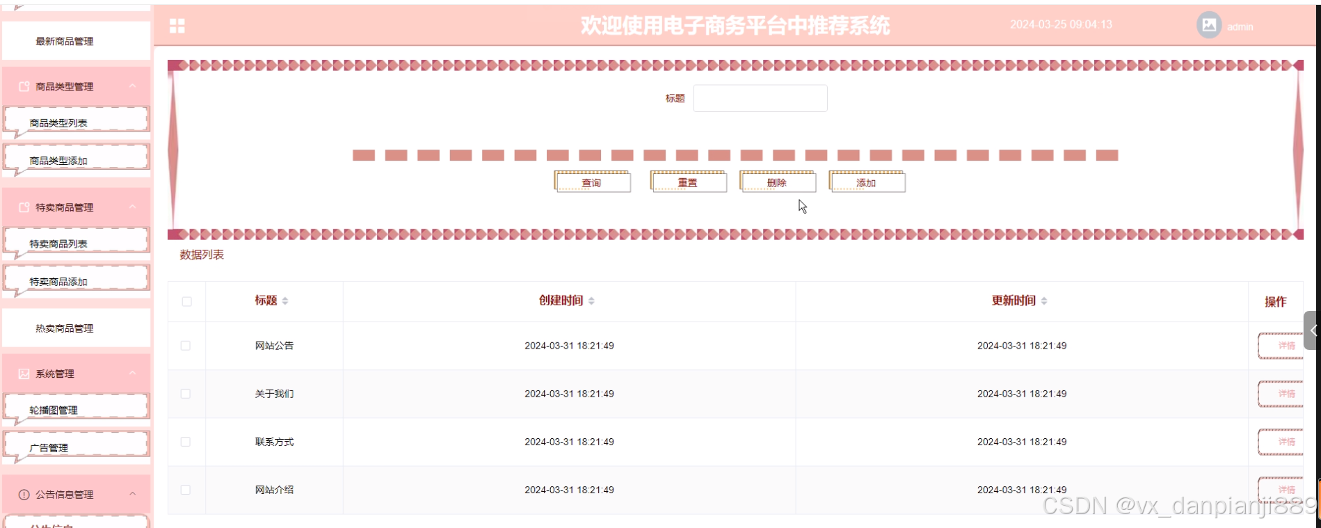 - 系统管理:管理人员在“系统管理”这一菜单下对轮播图和广告信息进行管控,可以对轮播图、广告信息进行查询、重置、添加和删除操作。