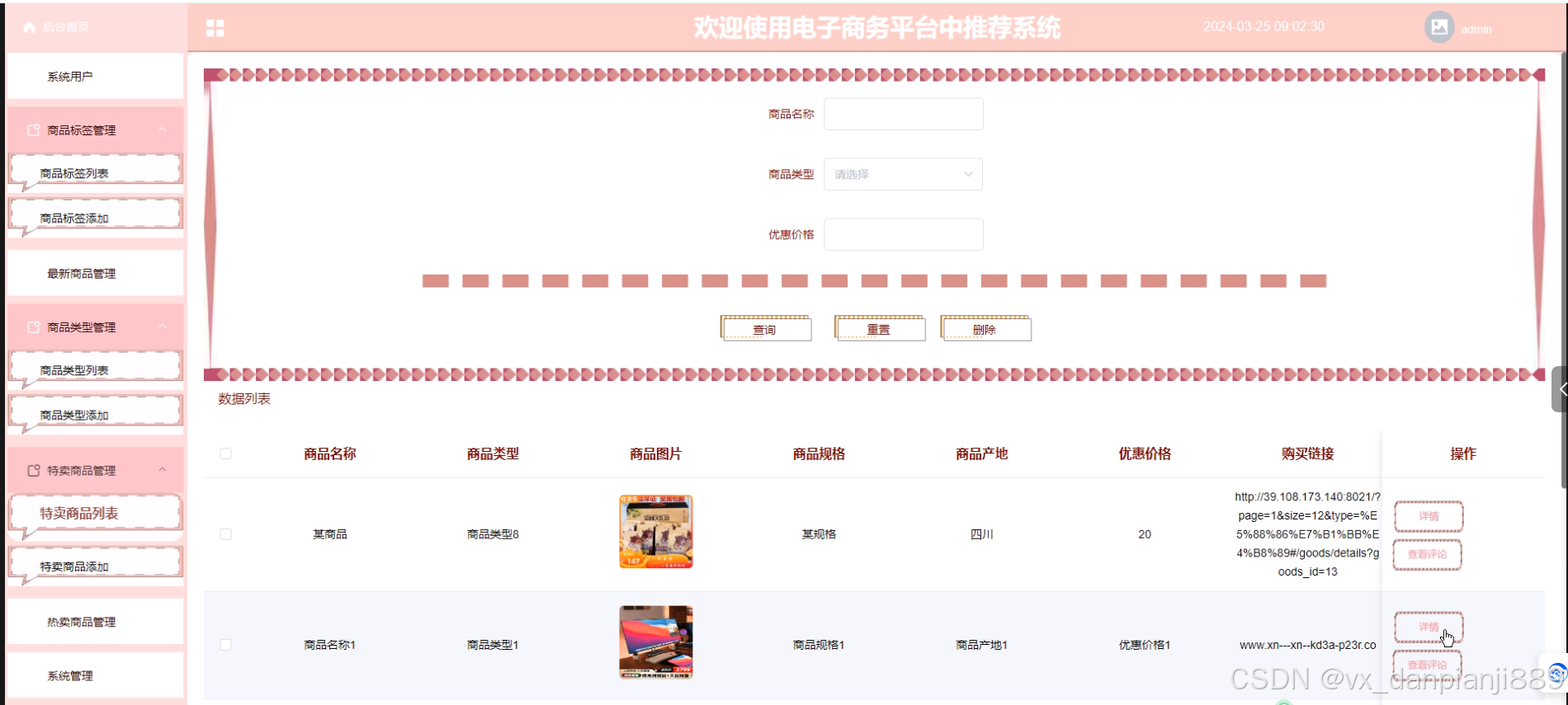 - 特卖商品管理:管理员可以查看特卖商品列表中某个商品的详情和评论,可以对特卖商品信息进行查询、重置、添加和删除操作。