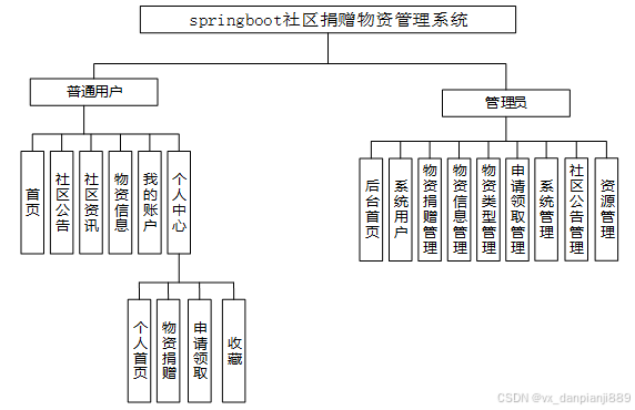 社区捐赠物资管理系统的功能主要分为普通用户和后台管理员一共两个角色。