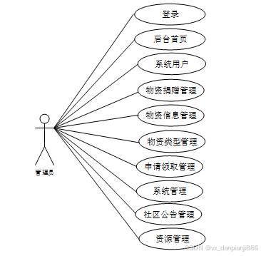 管理员的后台管理模块主要是对前台的注册普通用户和后台的护工用户、医生用户及管理员进行账户信息管理,同时对系统的系统用户、物资捐赠管理、物资信息管理、物资类型管理、申请领取管理、系统管理、社区公告管理、资源管理等信息进行管理。管理员用例图如下所示。