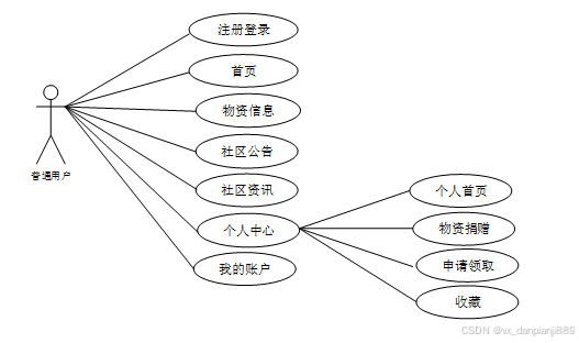 前台的主要功能模块有首页、物资信息、社区公告、社区资讯、我的账户、个人中心等。普通用户登录系统后不仅可以查看社区公告,浏览社区资讯,还可以查看物资信息并进行申领。在个人中心界面还可以对个人首页、物资捐赠、申请领取和收藏信息进行管理。普通用户用例图如下所示。