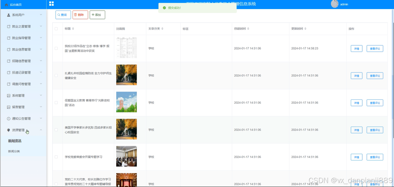 (3)就业之星管理:管理员点击“就业之星管理”会显示出所有的就业之星信息,支持标题名称对就业之星信息进行查询,如果想要添加新的就业之星信息,点击“添加”按钮,输入详细信息,点击“提交”按钮就可以添加了,同时可以选择某一条就业之星信息,点击“删除”进行删除。