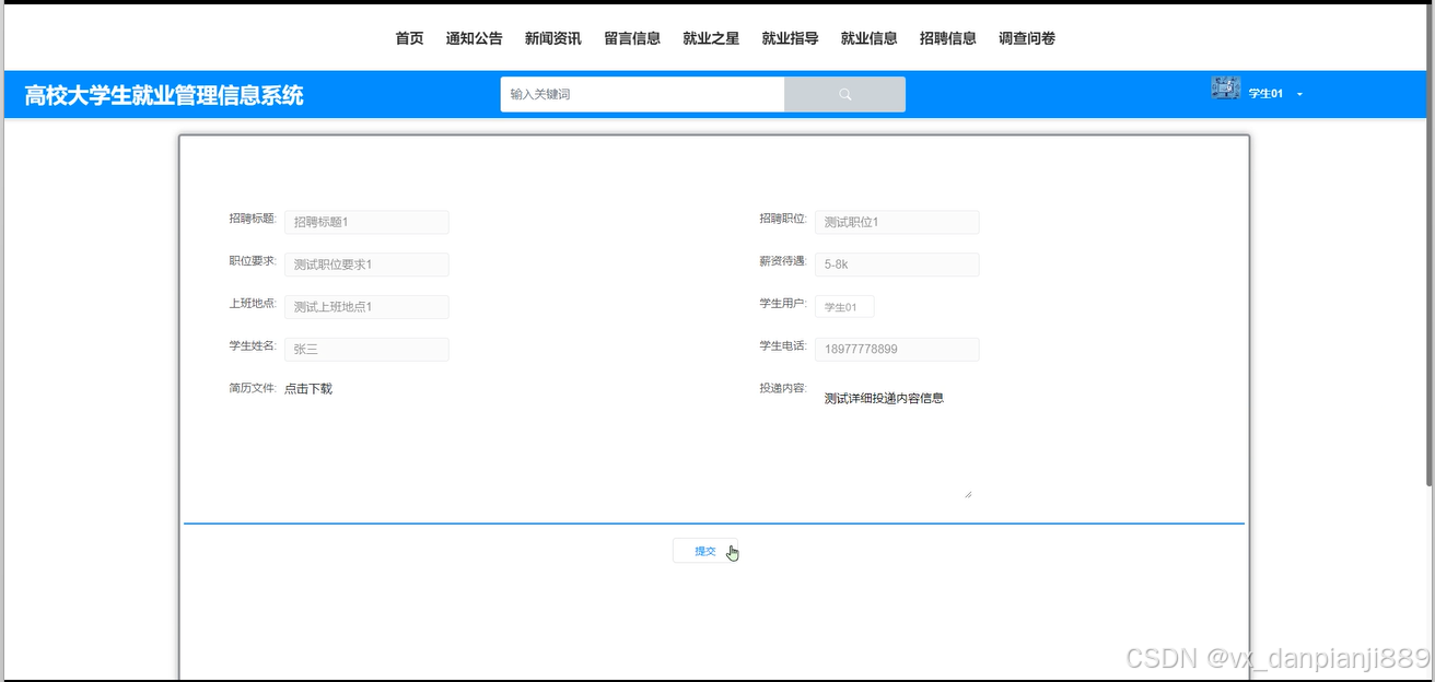 学生学号、从事行业、备注信息、学生用户、学生性别、学生电话等进行就业信息登记提交,同时支持用户对喜欢的就业指导进行点赞、收藏以及评论的功能。