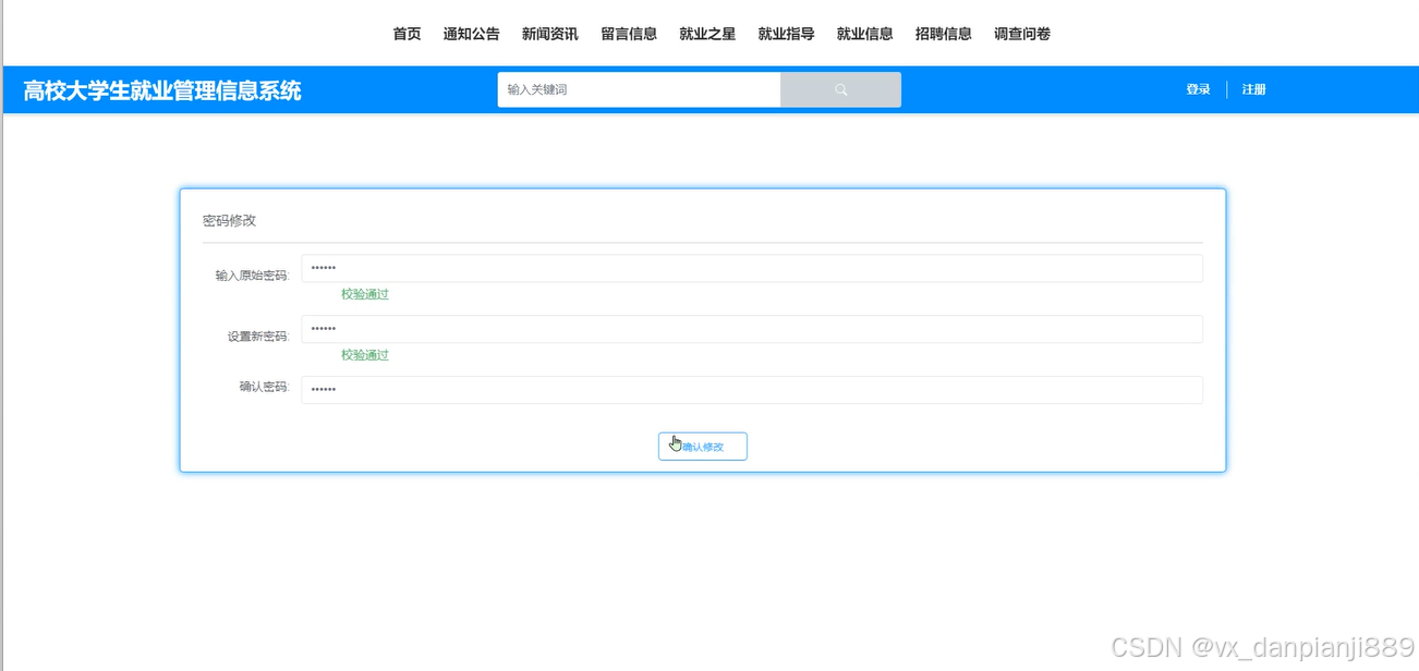 高校大学生高校大学生就业管理信息系统主要功能模块包括系统用户、就业之星管理、就业指导管理、就业信息管理、招聘信息管理、投递记录管理、调查问卷管理、系统管理、 留言管理、通知公告管理、资源管理等,采取面对对象的开发模式进行软件的开发和硬体的架设,能很好的满足实际使用的需求,完善了对应的软体架设以及程序编码的工作。本次软件设计中,以用户的实际操作流程作为整体开发的出发点,采用MVC设计模式,结合Java开发语言对软件开发原理,数据库采用目前流行的开源关系型数据库MySQL,使用SpringBoot框架技术整体开发源程序,最终实现一个高校大学生就业管理信息系统。