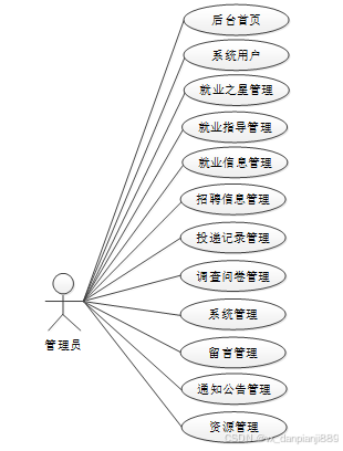 管理员管理模块:系统用户、就业之星管理、就业指导管理、就业信息管理、招聘信息管理、投递记录管理、调查问卷管理、系统管理、 留言管理、通知公告管理、资源管理等。