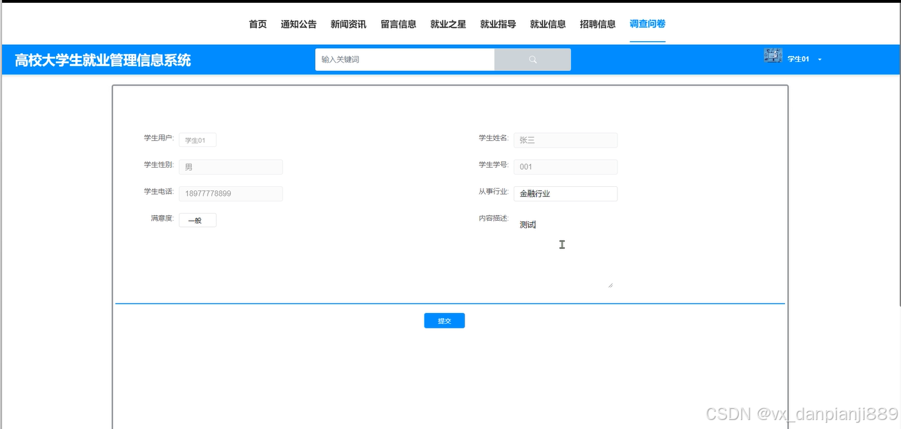 (10)调查问卷:用户点击调查问卷菜单可以直接通过输入学生用户、学生姓名、学生性别、学生学号、学生电话、从事行业、满意度、内容描述完成问卷调查的填写并提交。同时支持用户对喜欢的问卷调查进行点赞、收藏以及评论的功能。