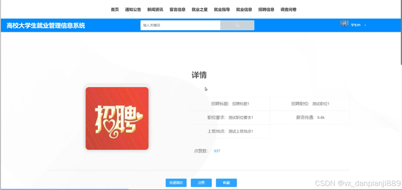 (9)招聘信息:用户点击招聘信息菜单可以查看所有的招聘信息的状态详情。支持通过招聘标题、招聘职位进行查询,在查询到自己想要了解的招聘信息信息的时候,可以进入查看详细的介绍,在招聘信息详情这个界面,同时支持用户对喜欢的招聘信息进行点赞、收藏、通过填写相关资料提交投递简历、以及评论的功能。