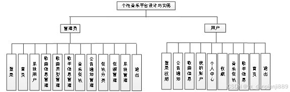 功能模块设计是为了将个性音乐平台的各个功能划分为不同的部分,使系统更加清晰和易于开发。我们设计了用户管理模块,包括注册、登录和个人信息管理;歌曲浏览与搜索模块,让用户可以方便地找到自己喜欢的音乐;歌曲播放与收藏模块,用户可以播放喜欢的音乐并将其收藏起来;评论与互动模块,用户可以发表评论、回复他人并进行点赞;后台管理模块,管理员可以管理用户、歌曲和歌手等信息;系统设置模块,管理员可以配置权限、歌曲分类和网站参数等。通过这些功能模块的设计,我们能够提供一个功能齐全、易于使用的个性音乐平台,让用户能够方便地浏览、播放、收藏音乐,并与其他用户进行互动和交流。