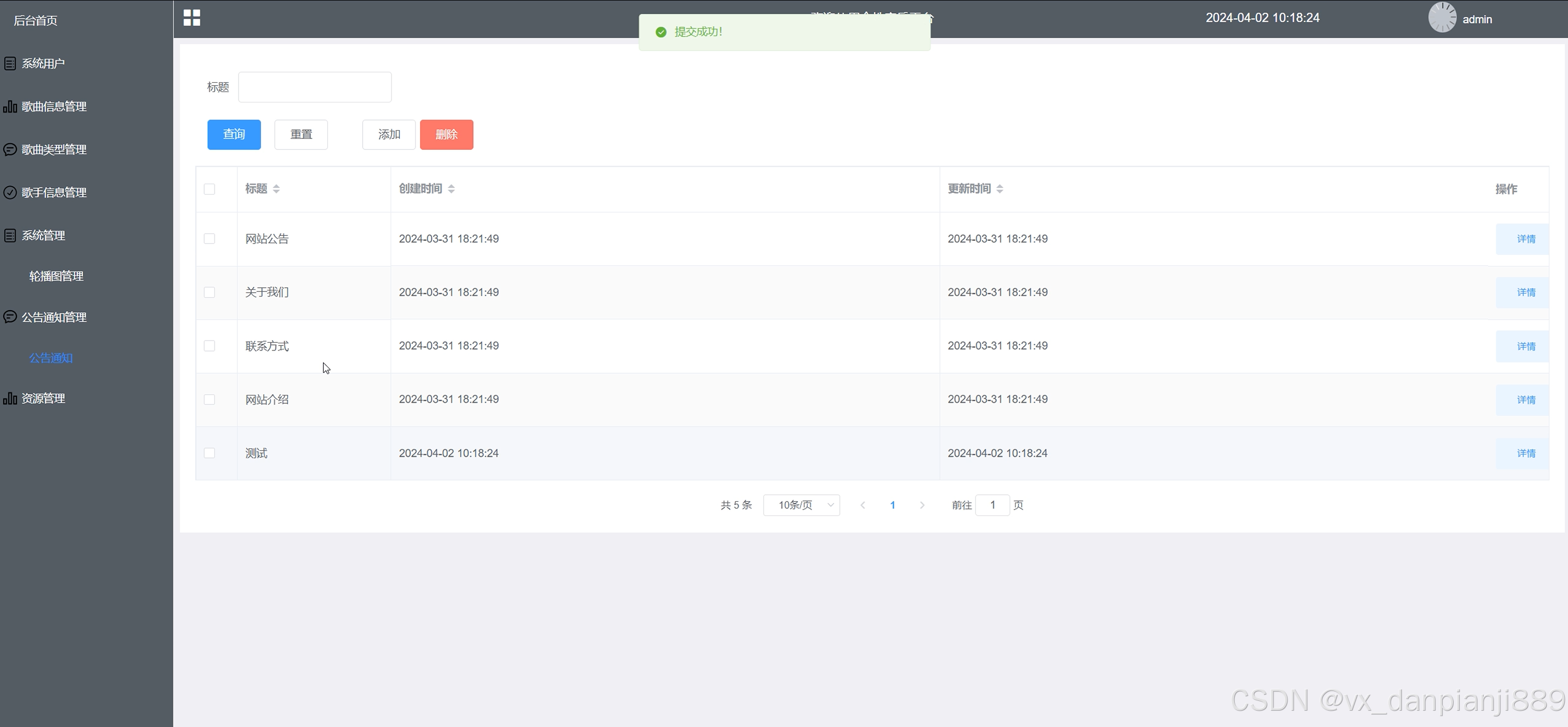 公告通知管理模块的实现允许管理员发布和管理网站的通知和公告信息,以便向用户传达重要的消息、更新或活动等,并提供一个易于编辑和展示公告内容的界面,确保用户及时获取到相关信息。