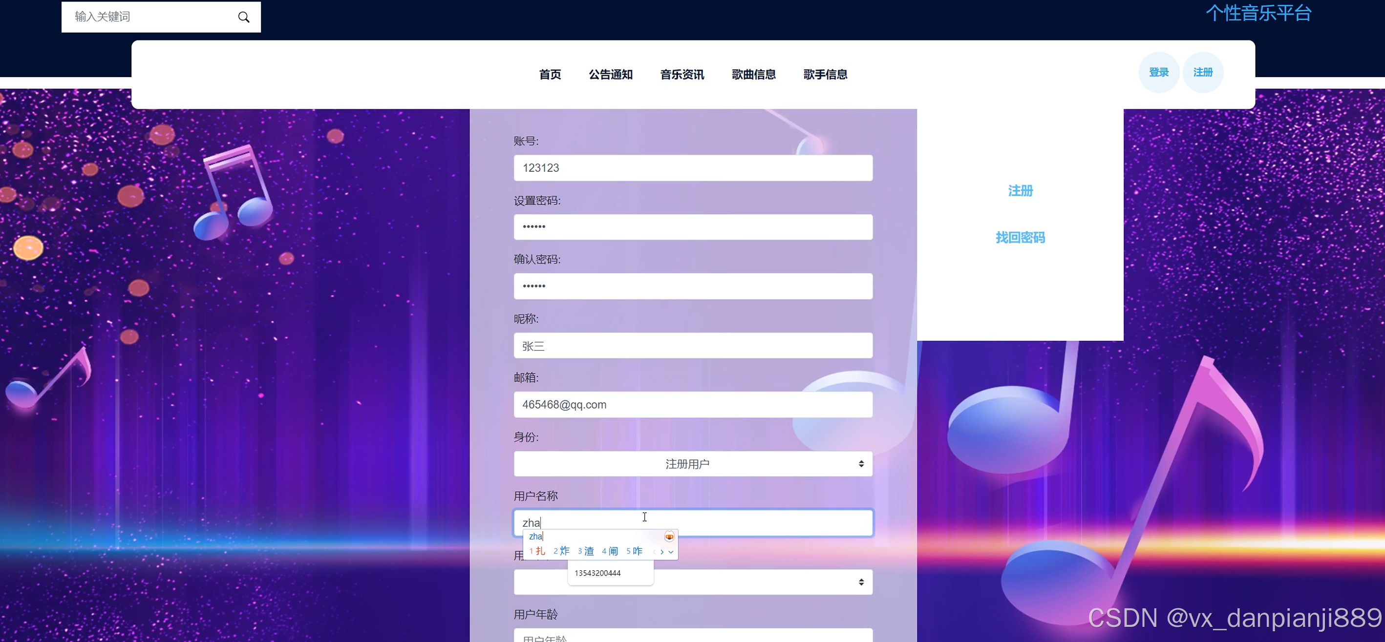 注册模块是个性音乐平台中的重要功能,它允许用户创建新的账号并加入系统。实现注册模块的步骤如下:首先创建用户表,存储用户的信息;然后创建注册页面,提供必要的输入框和注册按钮,让用户填写注册信息;处理注册请求,将用户提交的信息存储到数据库中;进行数据验证,确保用户名的唯一性和密码的符合要求;