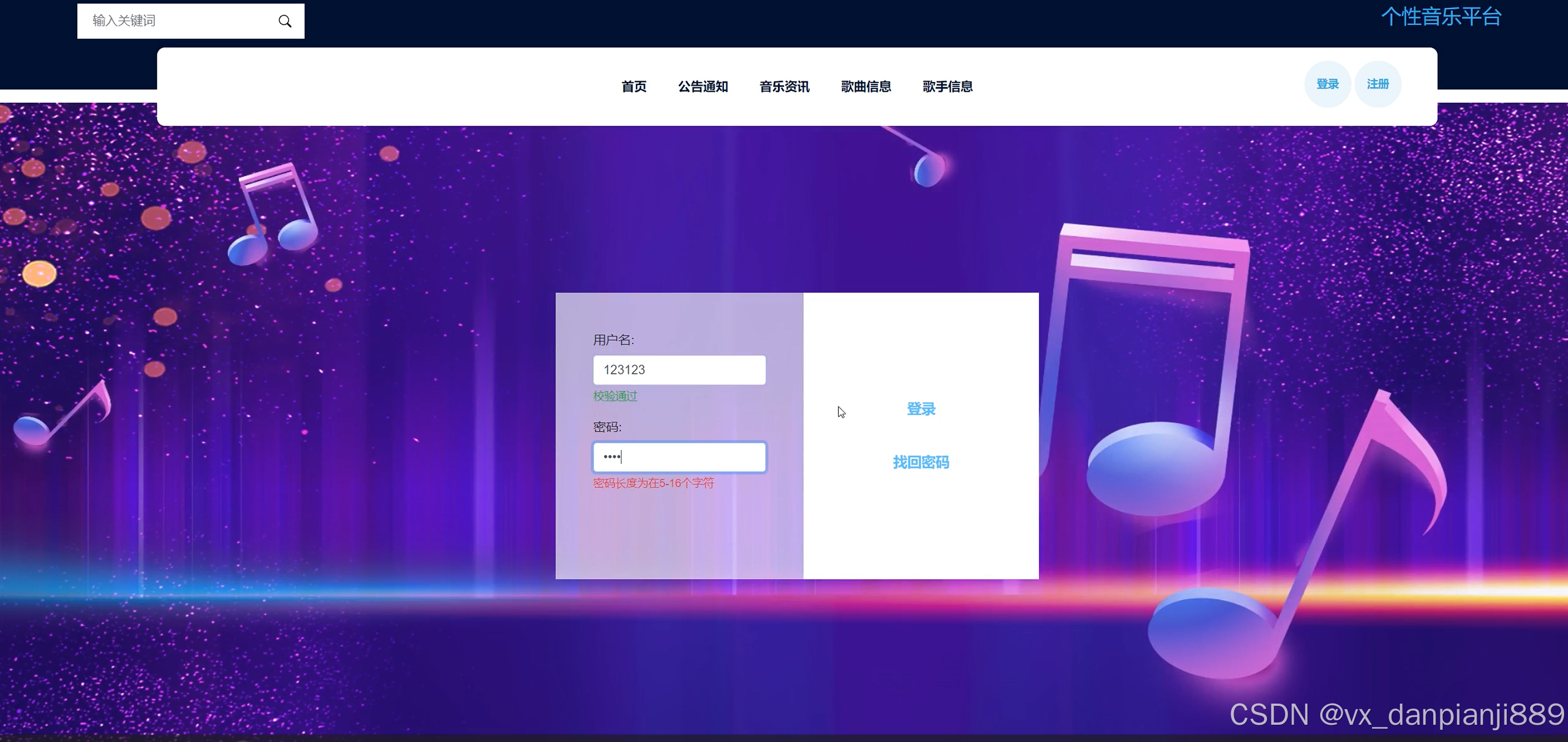在本次个性音乐平台的设计和实现过程中,我们运用了先进的技术和创新的方法,成功地实现了多项功能。通过使用HTML、CSS和JavaScript等前端技术,我们打造了一个直观友好的用户界面,并提供了登录、注册、歌曲信息管理、歌手信息管理模块等核心功能。同时,我们采用后端开发语言和数据库来支持数据存储、用户认证和系统逻辑处理等方面。