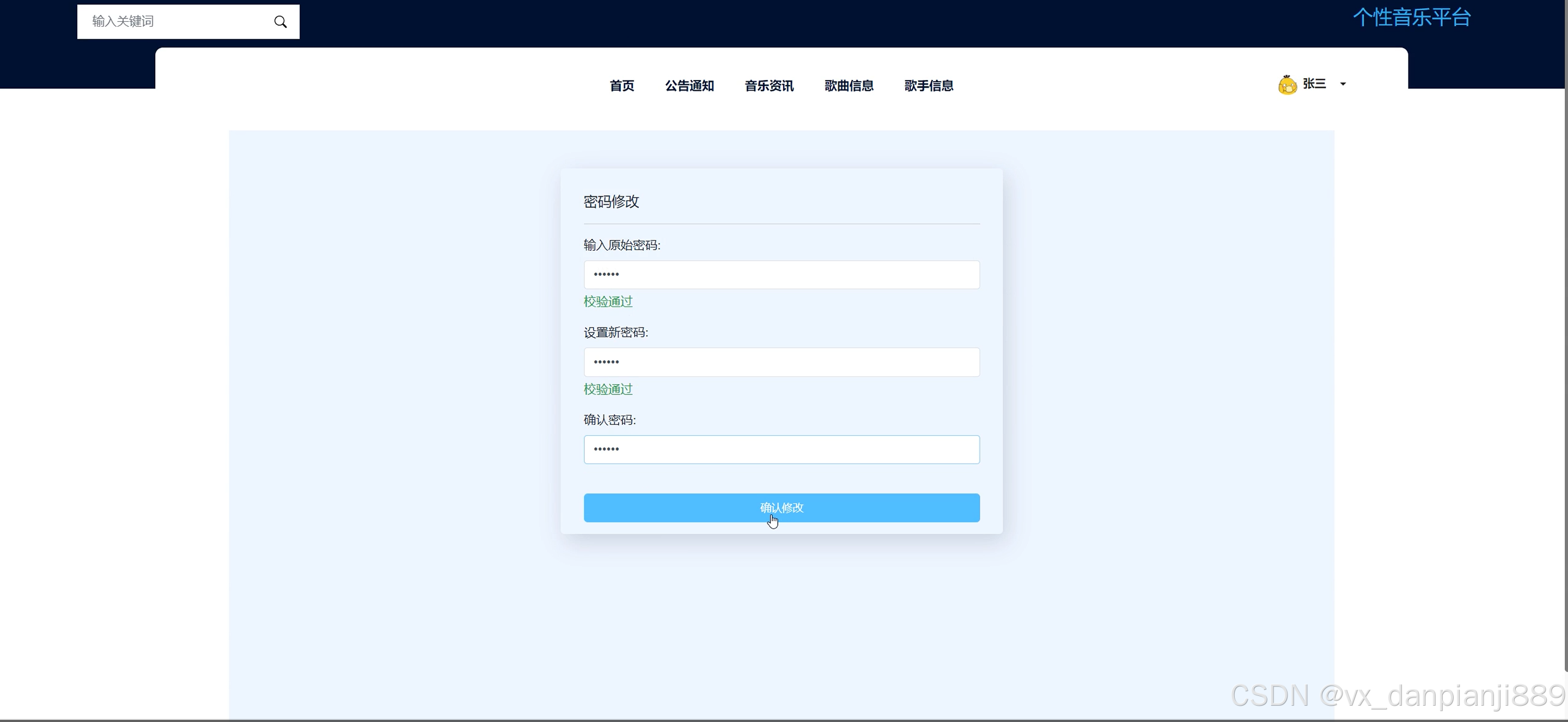 密码修改模块是个性音乐平台中的一个重要功能,它允许已注册用户更改登录密码。实现密码修改模块的步骤如下:首先提供密码修改页面,让用户输入旧密码、新密码和确认新密码;进行身份验证,确保用户输入的旧密码与数据库中存储的密码匹配;处理密码修改请求,对新密码进行加密处理并更新到数据库;进行数据验证,检查旧密码是否正确,新密码是否符合要求;最后提供相应的提示信息,告知用户密码修改成功或失败的结果。密码修改流程图如下所示。