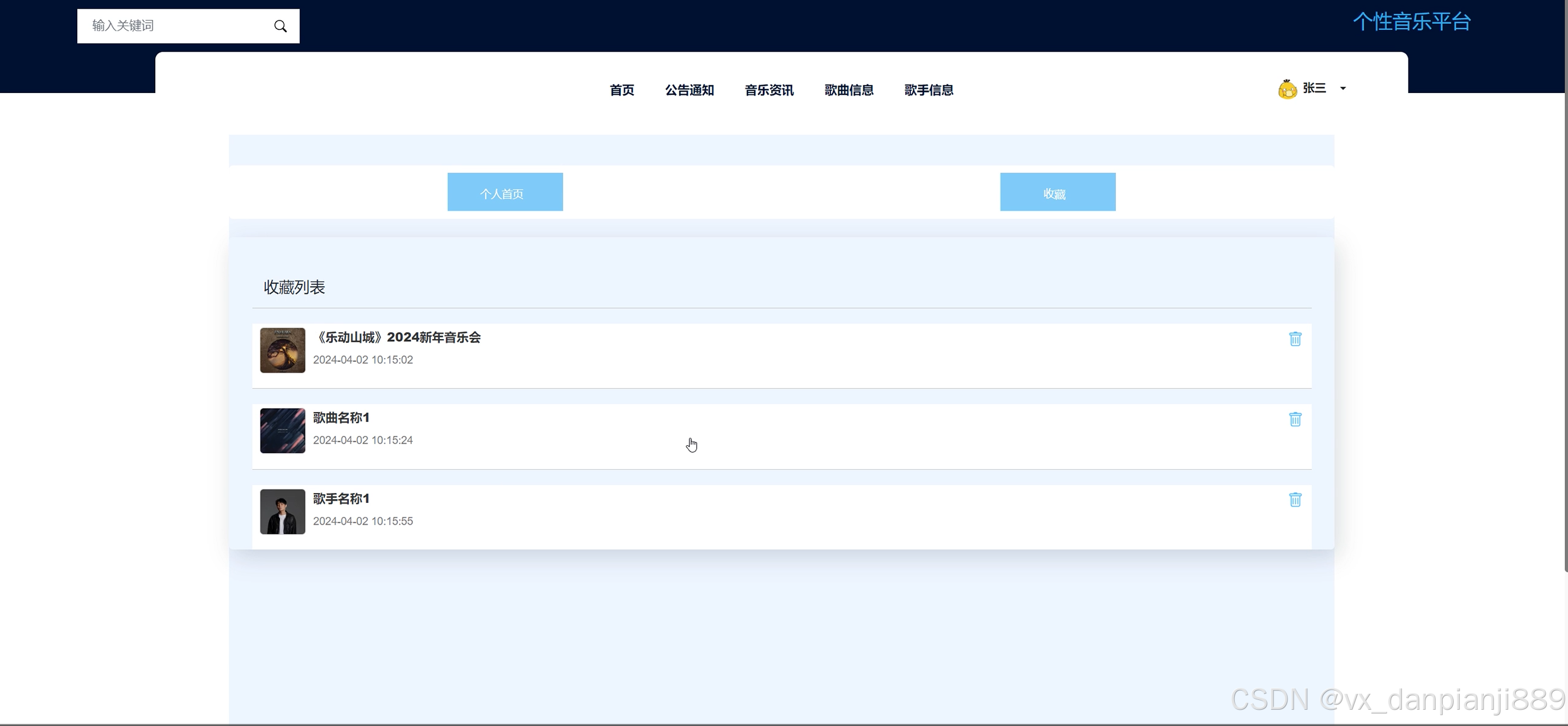 收藏模块的实现是为用户提供一个便捷的方式来收藏喜欢的音乐资讯、歌曲名称、歌手名称等。让用户能够快速访问和播放收藏的内容。收藏界面如下图所示。