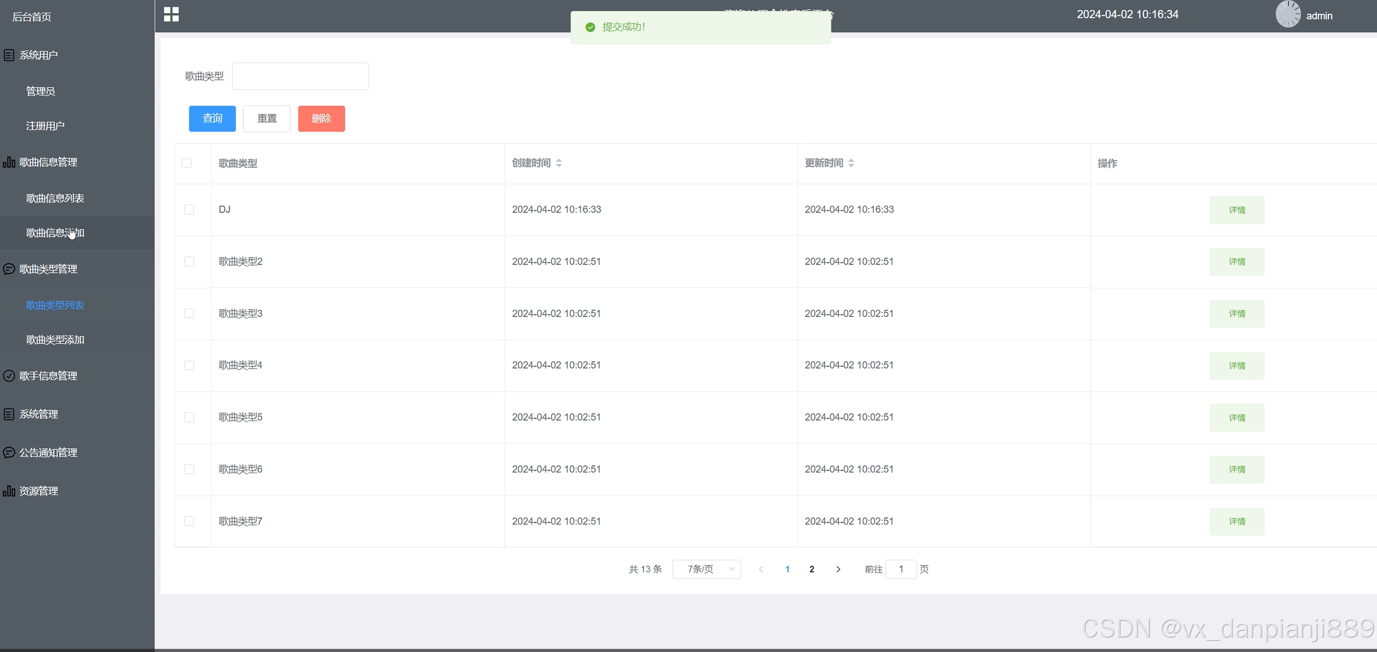| 用例描述 | 管理员在成功登录后台管理的条件下,对歌曲类型模块进行管理 |
