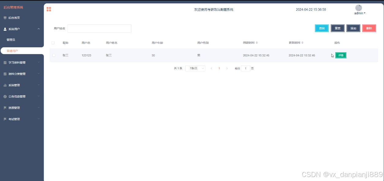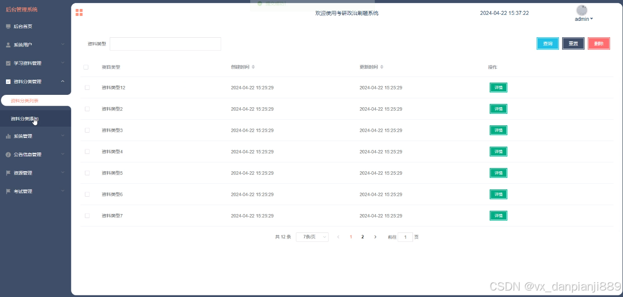 学习资料管理:点击“学习资料”这个菜单,可以查看到学习资料,进行查询,添加、删除等操作。界面如下图所示。