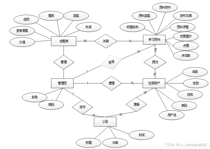 数据库概念结构设计主要涉及数据库的实体和实体之间的关系。通过实体-关系模型或者其他适当的模型,我们将定义系统中涉及的各个实体以及它们之间的联系。下面是整个基于微信小程序的考研政治刷题系统的总E-R关系图。