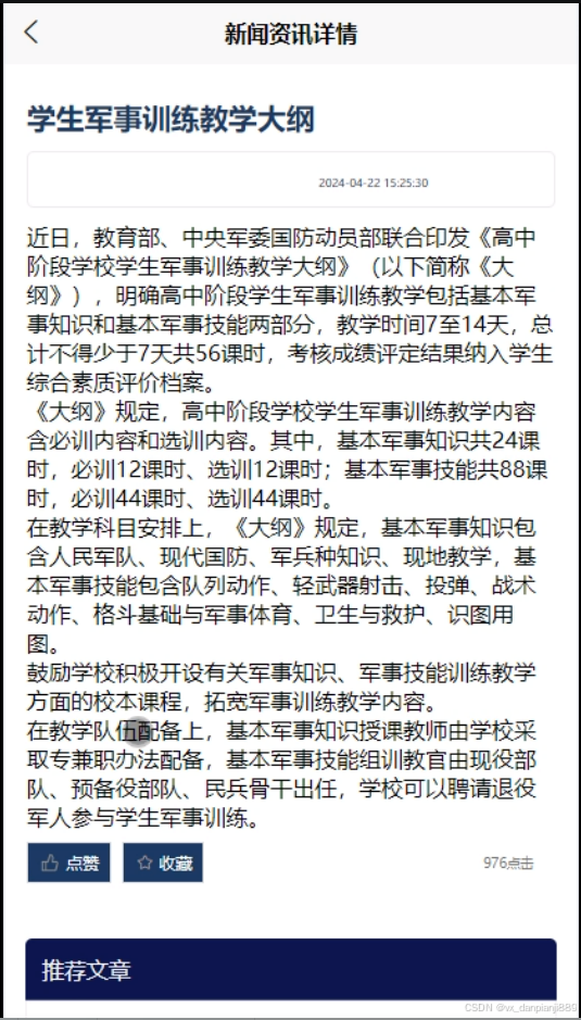 新闻资讯:当用户点击下方导航栏“新闻资讯”这一菜单按钮,会显示管理员在后台发布的所有的新闻资讯,可以查看详情,进行添加点赞、收藏、评论等。界面如下图所示。 、