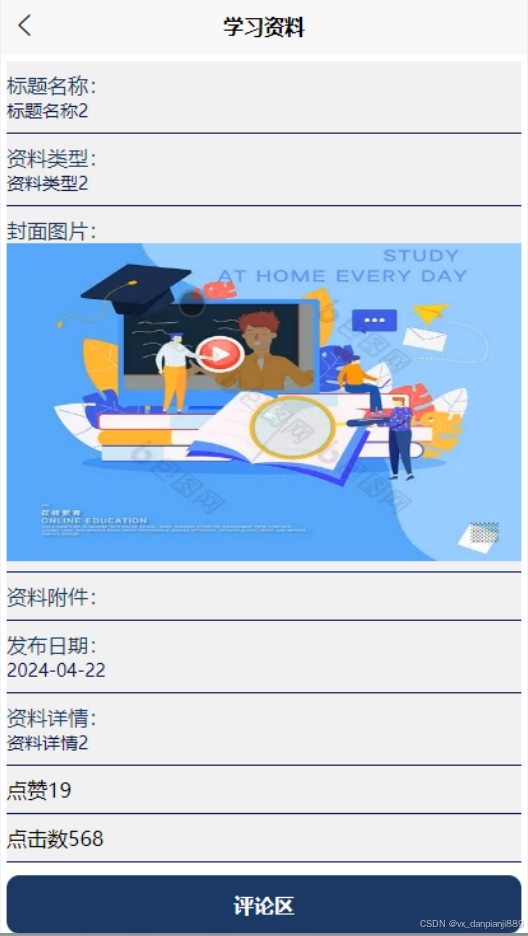 (4)学习资料:当用户点击下方导航栏“学习资料”这一菜单按钮,会显示管理员在后台发布的所有的学习资料,可以查看详情,进行点赞、收藏、评论等。