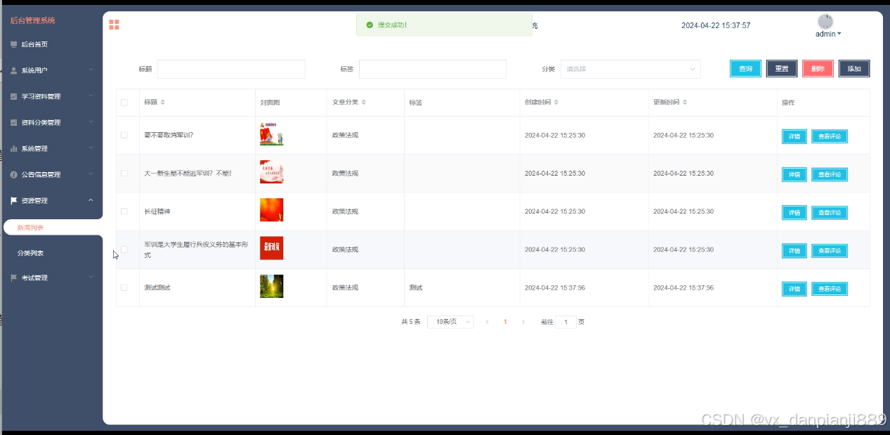 (4)资源管理:进入后台首页工具栏点击“资源管理”这个按钮可以查看所有新闻列表、分类列表等信息,可以进行详情查看、删除、查看评论等操作。