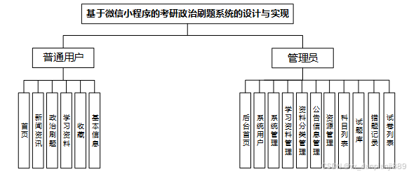 基于微信小程序的考研政治刷题系统划分为了用户管理模块和管理员模块这两大部分。