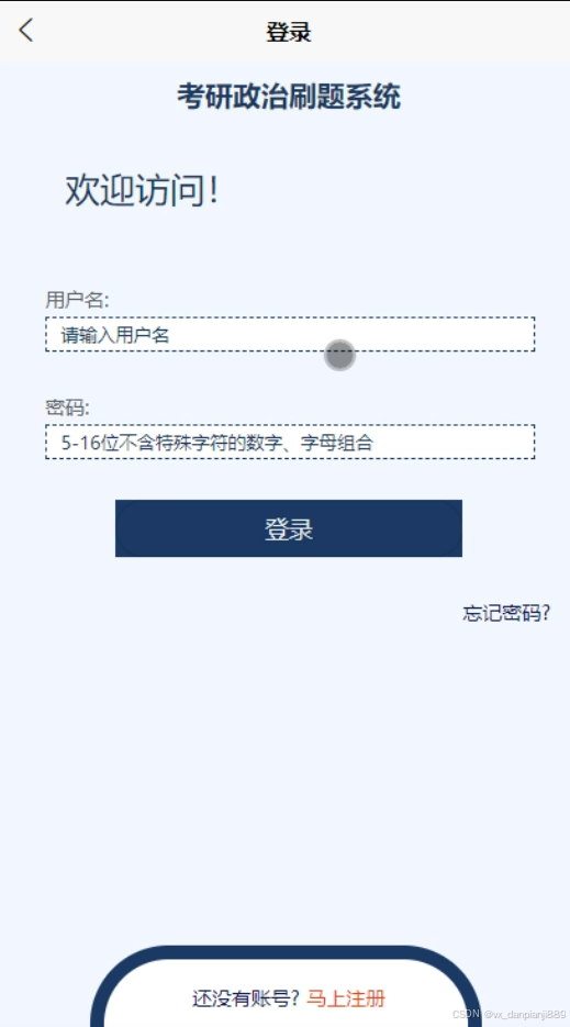 (1)登录:基于微信小程序的考研政治刷题系统前台注册后的用户是可以通过自己的账户名和密码进行登录的,当用户输入完整的自己的账户名和密码后,点击“登录”按钮后,将会首先验证输入的有没有空数据,再次验证输入的账户名+密码和数据库中当前保存的用户信息是否一致,只有在一致后将会登录成功并自动跳转到基于微信小程序的考研政治刷题系统的首页中;否则将会提示相应错误信息。