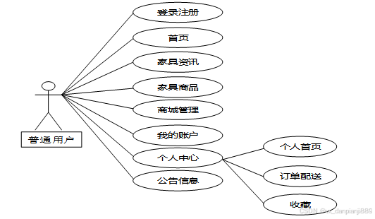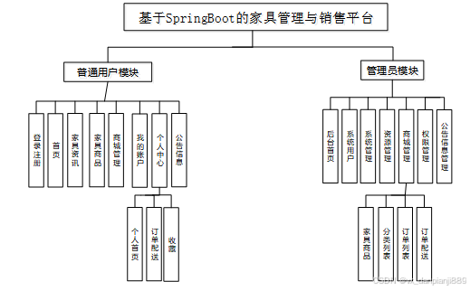 按照基于SpringBoot的家具管理与销售平台的角色,系统划分为了普通用户模块和管理员模块这两大部分。在设计和实现基于Spring Boot的家具管理与销售平台时,我们需要充分考虑普通用户和管理员的不同需求,以确保系统能够满足各类用户的功能要求。以下是针对不同用户角色的功能分析: