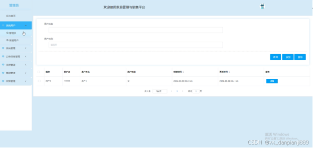 基于SpringBoot的家具管理与销售平台中的管理人员是可以对注册的普通用户进行管理的,也可以对管理员进行管控。界面如下图4-10所示。