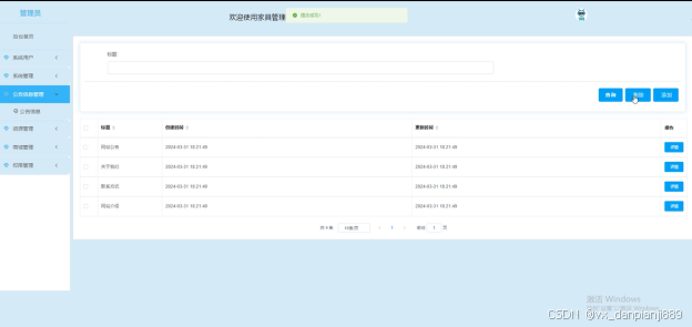 管理员点击“公告信息管理”菜单,管理员可以查看和管理系统上的所有公告信息信息,包括添加、修改或删除公告信息等操作,界面如下图所示。