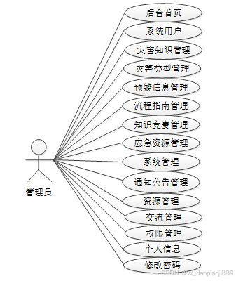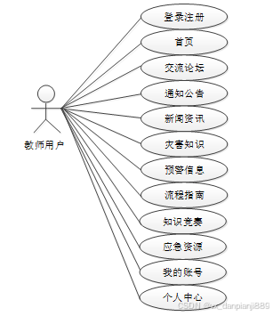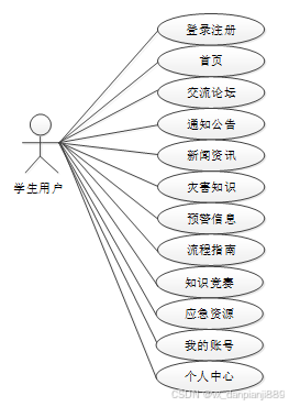 对高校灾害紧急管理平台做需求做解析后,该系统主要分为学生用户、教师用户和管理员三大模块。该系统的用户角色用例图分别是图2-1、图2-2和图2-3。