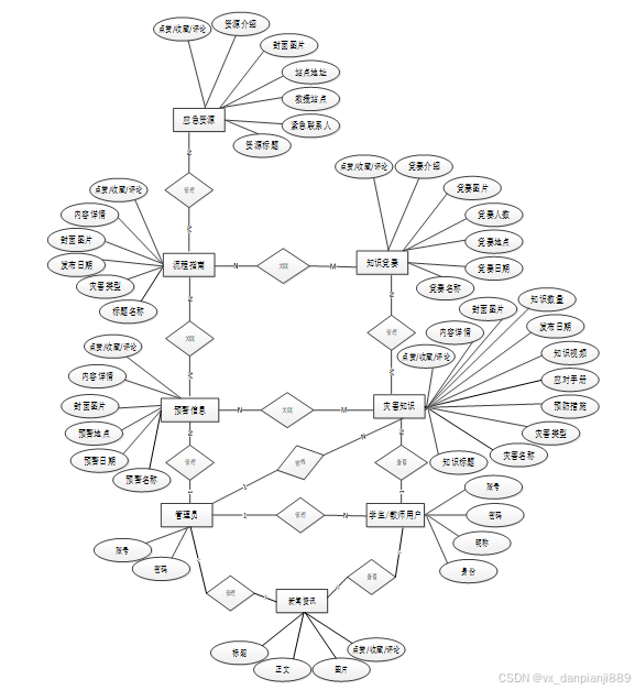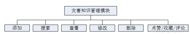 高校灾害紧急管理平台中需要存储不少记录信息和数据,包括新闻资讯、灾害知识、预警信息、流程指南、知识竞赛、应急资源等,这里以灾害知识管理模块为例,学生用户和教师用户可查看管理员发布的所有灾害知识信息,支持关键字(知识标题、灾害类型)搜索和下拉(灾害类型、排序)搜索,点击可查看详情,进行点赞、收藏和评论,管理员可查看发布的所有灾害知识,进行增改删查操作,。具体的结构图如下: