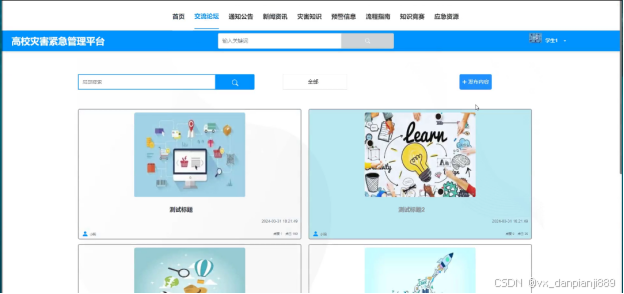 The development of a disaster emergency management platform in universities allows students and teachers to quickly access the latest information and comprehensive disaster knowledge, warning information, process guidelines, and other disaster emergency information at any time, so that they can quickly take corresponding response and emergency measures, reduce losses and injuries caused by accidents; And enhance information exchange and sharing, enhance user interaction, and enhance user experience. At the same time, provide administrators with a tool for emergency management of university disasters, and improve the efficiency of university disaster emergency management.