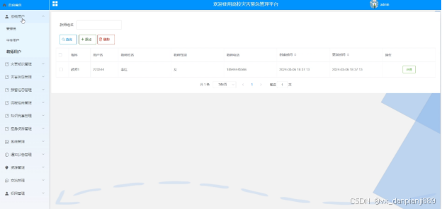 可对学生用户、教师用户和管理员进行管控,包括进行增删改查操作,点击可查看详情。界面如下图所示。