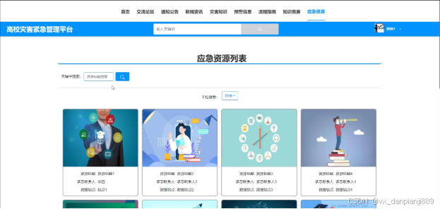 可查看管理员发布的所有应急资源信息,支持关键字(资源标题)搜索和下拉(排序)搜索,点击可查看详情,进行点赞、收藏和评论。界面如下图所示。