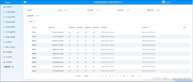 - 权限管理:可对用户组的权限进行管理,进行增删改查操作,支持权限名、用户组、添加权限、修改权限、删除权限、查询权限搜索,可点击修改(添加、修改、删除、查询)操作。