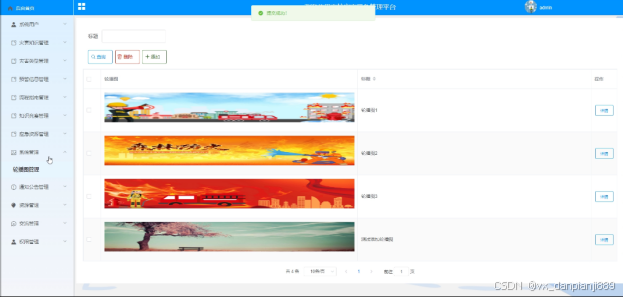可对首页的轮播图进行管理,进行增删改查操作,支持标题搜索,可点击查看详情。界面如下图所示。