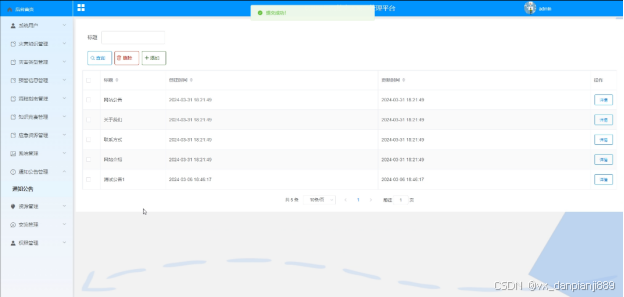 可对通知公告进行管理,进行增删改查操作,支持标题搜索,可点击查看详情。界面如下图所示。