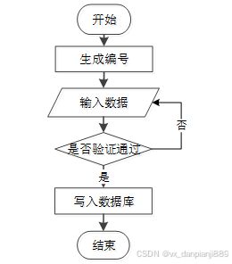 用户成功登入系统后就能够实现增加数据的操作,增加数据的编号由系统生成,用户不能随意填写,除了编号以外,其他增加信息用户自己填写,填写后的信息经过系统验证,验证通过后即可完成数据新增,数据新增的流程图如下图2-1所示。