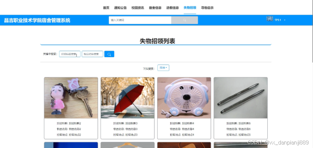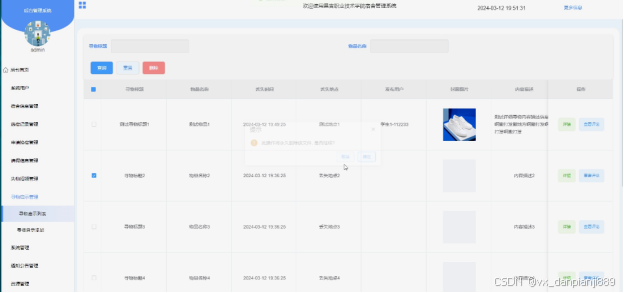 - 失物招领管理:可查看所有失物招领信息,进行增改删查操作,支持招领标题、物品名称搜索,可点击查看详情和查看评论。