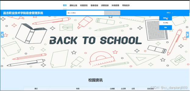 - 校园资讯:可查看发布的所有校园资讯信息,支持局部搜索和下拉(筛选、排序)搜索,热门文章推荐,点击可查看详情,进行点赞、收藏和评论