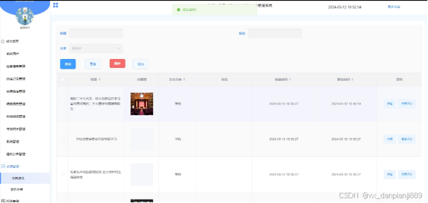 - 资源管理:可对校园资讯和资讯分类进行管理,进行增删改查操作,校园资讯支持标题、标签、分类搜索,可点击查看详情(封面图、标题、分类、标签、描述、正文)和查看评论;资讯分类支持类型名称搜索,可点击查看详情。