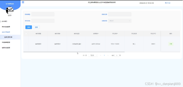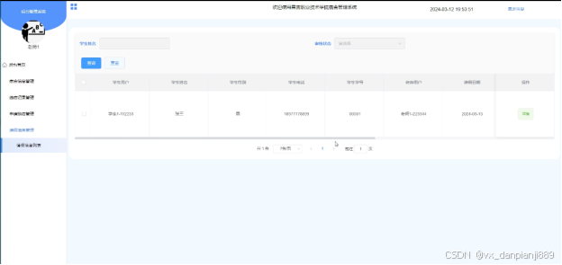 - 请假信息管理:可查看自己的所有请假信息信息,进行查询操作,支持学生姓名、审核状态搜索,可点击查看详情,进行审核。