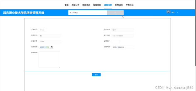 - 请假信息:可填写请假信息(老师用户、请假日期、请假天数、请假原因)并提交