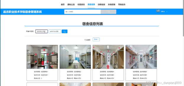 - 宿舍信息管理:可查看所有宿舍信息,进行查询和删除操作,支持宿舍楼栋、宿舍名称,点击可查看详情和查看评论。