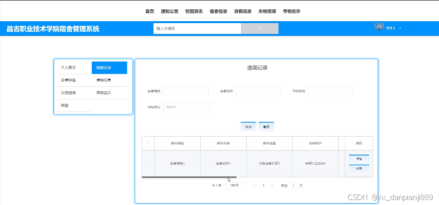 - 选宿记录管理:可查看所有选宿记录信息,进行增改删查操作,支持宿舍楼栋、宿舍名称、学生姓名、审核状态搜索,可点击查看详情,进行审核,并可点击换宿操作,填写换宿信息(换宿原因)并提交。