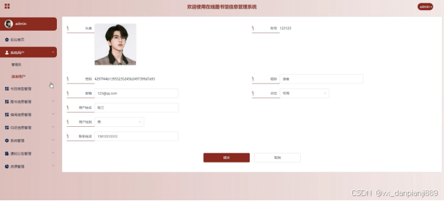 - 用户管理:管理员可以查看系统用户(管理员/普通用户)列表中某一用户的详情,可以对用户信息进行增删改查操作。