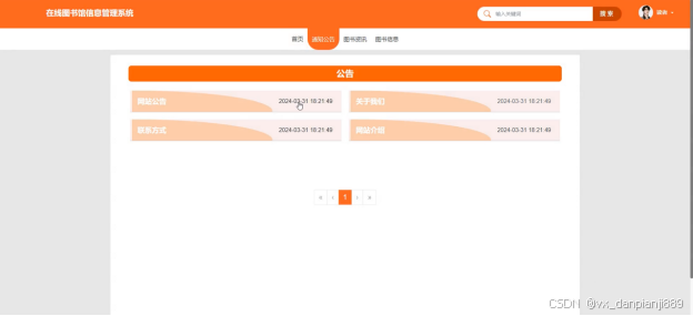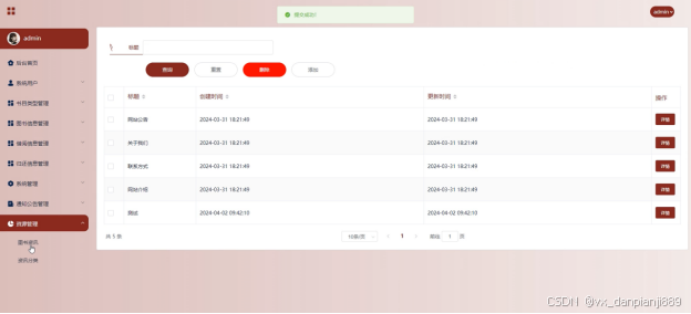 - 通知公告:在通知公告界面,管理员对通知公告进行管控。管理员可以对通知公告信息进行增删改查操作。