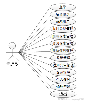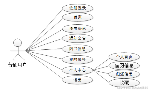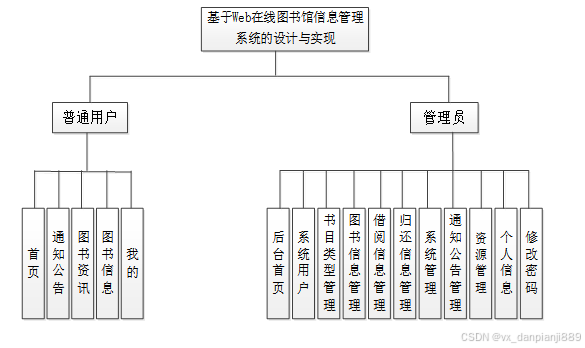 按照在线图书馆信息管理系统的角色,主要包括普通用户模块和管理员这两大功能模块,各模块功能内容如下: