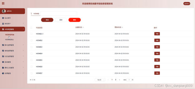 - 书目类型:管理员可以查看书目类型列表中某个类型的详情,可以对书目类型信息进行增删改查操作。